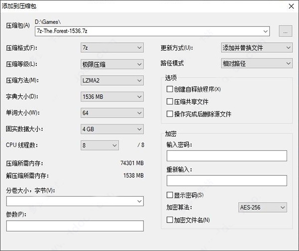 总结:极限压缩,字典大小和单词大小设到顶,固实大小大于内容大小,CPU线程数量力而行。