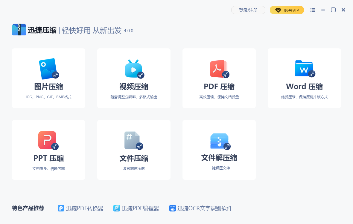 迅捷压缩软件是由上海互盾信息科技有限公司推出的一款小巧实用,功能强大的高效智能压缩软件,支持一键批量压缩图片、视频、PDF、Word、PPT多种文件自定义压缩参数,高效无损压缩。它程序界面简洁,功能一目了然,能够为用户提供最优质的文档压缩服务,可压缩图片、视频以及PDF文档,视频压缩时可调整分辨率,PDF文档可进行高级压缩,使用OCR将压缩后的PDF转换为可编辑文本,简单易用,有需求的用户请下载体验!