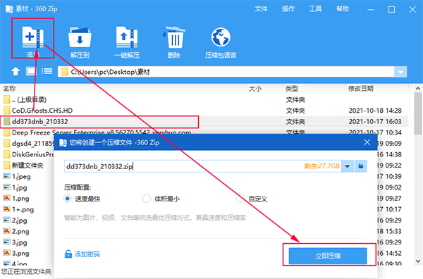 选中一个或多个文件后,鼠标右键单击文件,在弹出的右键菜单中,选择【添加到压缩文件…】,在新弹出的【您将创建一个压缩文件】窗口中,设置好压缩选项,点击【立即压缩】即可进行压缩操作。如果生成的压缩文件想保存在当前文件夹下,也可选择【添加到“文件名。zip“】,实现快捷的压缩。