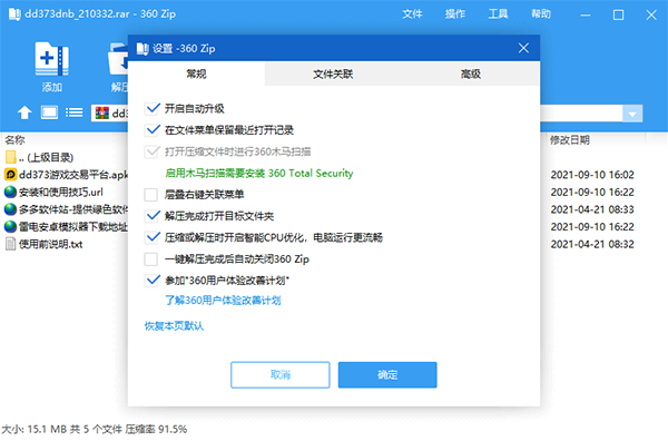 在360压缩的右上菜单,点击【工具】,选择【选项】,并在新弹出的【设置】界面中,点击【文件关联】标签,通过勾选不同的压缩格式来更改软件默认的压缩格式关联,点击【确定】来确认更改的压缩格式关联。