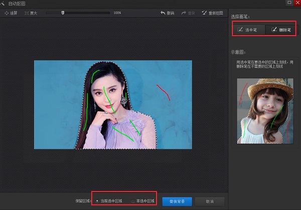 3、我们通过放大功能来将图片放大,这样就能够更加方便我们对该图像进行编辑。在该页面中可以选择画笔,画笔中可以选择的有选中笔、删除笔两个选项。在这里我们选择点击【选中笔】选项,使用该画笔在移动背景中画上一笔即可。如果背景不能全部涵盖进去的话,再继续涂画没有涵盖的区域即可。其实,如果所要抠取的是一个色彩比较单一的物体的话,直接在该物体上涂画即可。