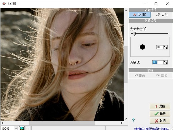 2、选择“祛斑”后打开如下图所示,我们先对半径和力量所调整,一般画笔半径要比去除的水印要大,力量设定为130左右。设置好后用鼠标点击水印处,就能看到去除水印的效果了。(注意:为了修改更加完美建议大家点击可放大图像进行编辑,点击下方的小工具调整。还可以点击“对比”查看修改情况。)