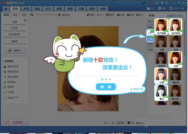 可以说这是该软件最为重要的功能,在这里用户可以对自己的照片进行美形、美肤、眼部以及消除红眼、染发等诸多的美容操作。同时如果用户觉得这些操作一个一个去做很麻烦,那么就可以直接使用“智能美容”按钮可以帮助用户直接进行一键美容。