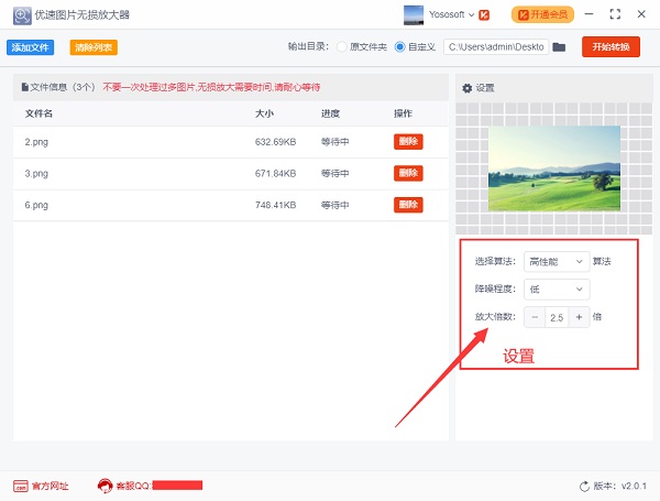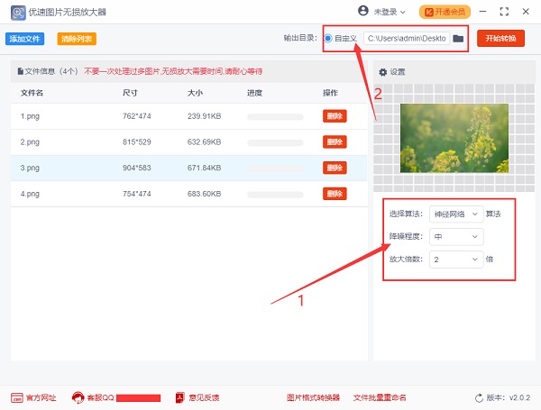 步骤2,如下图所示位置进行设置,先选择一种无损放大智能算法(二选一,效果差不多,放大倍数不一样);在设置图片的降噪程度,降噪可以有效提高图片清晰度;然后再根据自己的需求设置放大倍数。在软件上方设置图片放大后的输出目录。