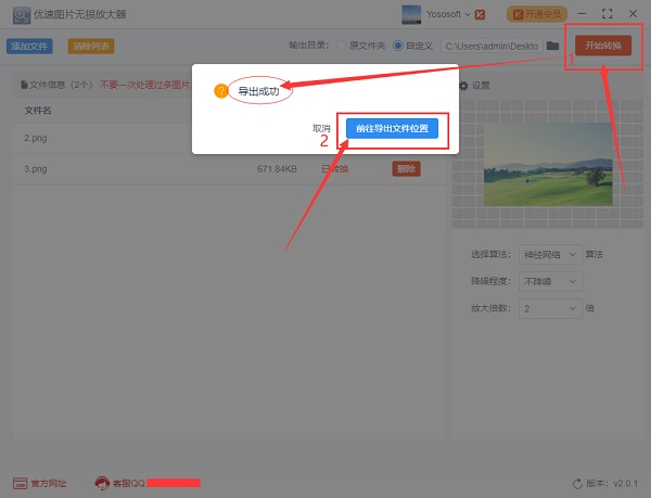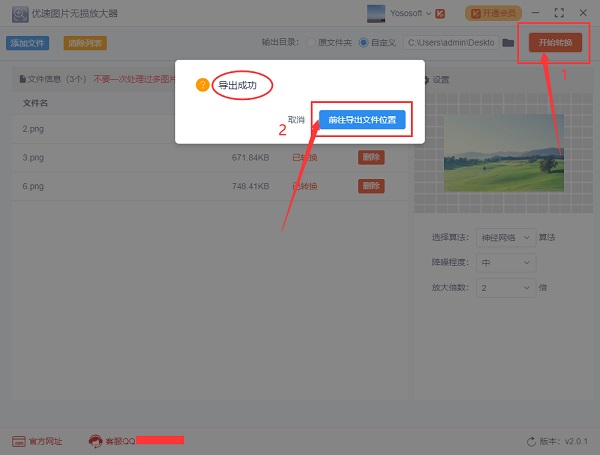 步骤3,设置好了后可以点击【开始转换】红色按钮,启动放大程序了,当软件弹出“成功”的提示框后说明图片放大完成,点击提示框上的【前往导出文件位置】按钮,就可以打开查看放大后的图片了。