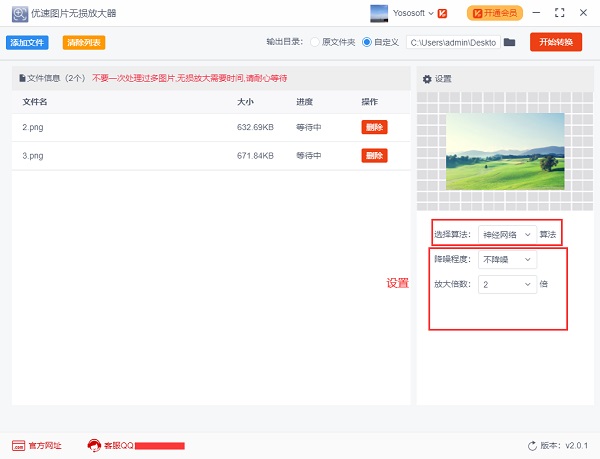 步骤2,然后进行设置,目前软件有两种AI算法(神经网络算法和高性能算法),任选一个即可,再根据自己需求设置降噪程度和放大倍数。