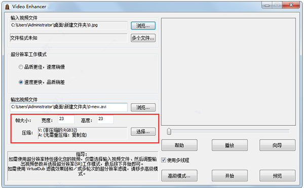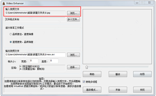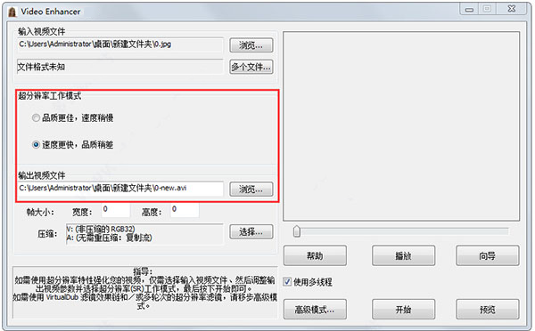 2、设置分辨率工作模式,填写输出视频文件路径。