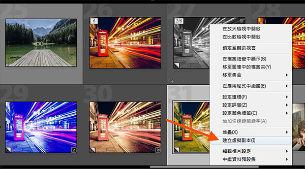 很多时候,即使是同一张相片,我们都会想试试不同的修图方式,来比较哪个最好,建立虚拟副本的好处,就是你无需自行复制几个档案,又或储存不同的设定,在不额外增加存档空间的情况下,就可以有几个副本让你修改。用右击(如下图) 就可以建立虚拟副本(virtual copy),又或用 ctrl / command + ‘
