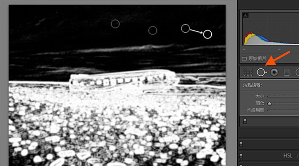 污点移除是非常方便的工具,尤其如果你要处理的是镜头入尘,又或一些简单的污点 (如湖上的落叶),按Q键或如下图箭嘴所指着的工具,就可进行清除。而更为重点的,就是下图圆圈位置,剔选的话会使影像会变成负片,并且可以使用滑杆来改变对比度,以突出有污点的地方,这样去除起来就舒服多了。如果没有了下层的工具列,可以按T键让它重新出现。