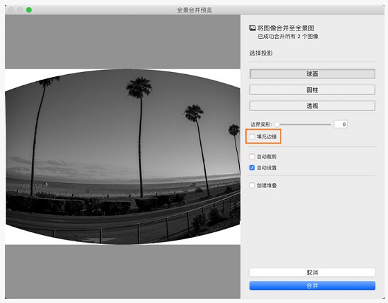 在合并照片以创建全景图/HDR 全景图时,您可以在全景合并预览/HDR 全景合并预览对话框中选择填充边缘选项。
