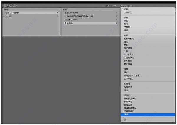 现在,您可以查找具有景深信息的照片,方法是使用图库过滤器栏中的元数据选项,选择深度作为元数据过滤条件。