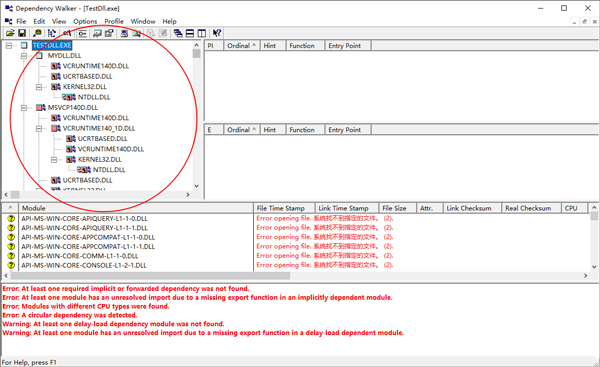 圈选部分为TestDll.exe的依赖关系,它依赖MyDll.dll、MSVCP1400.DLL等,其各自又依赖其他DLL。