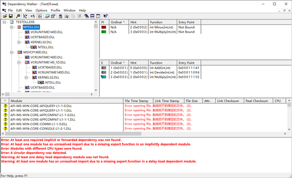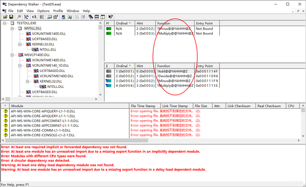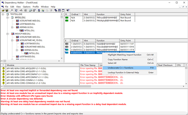 如果将MyDll中的函数int Minus(int, int)删除,重新生成MyDll.dll,然后再次查看TestDll.exe的依赖关系,显示如下:
