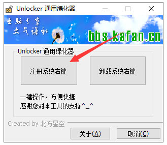3、双击Unlocker绿化器.exe,点击注册系统右键,即可出现在鼠标右键的系统中,不需要的话点击卸载系统右键: