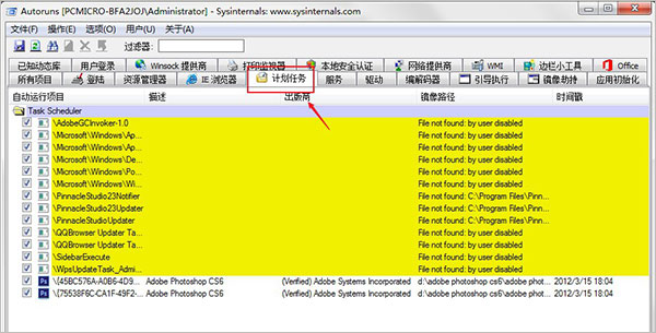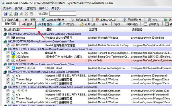 全部的开机自启动项都在这个标签下啦。另外,它也是双击autoruns.exe弹出窗口缺省定位的标签,包括其他标签的所有内容。