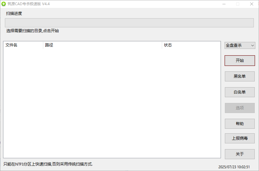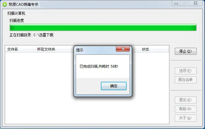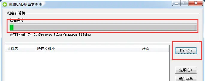 1、打开筑原CAD病毒专杀条件,点击开始,等待进度条走完