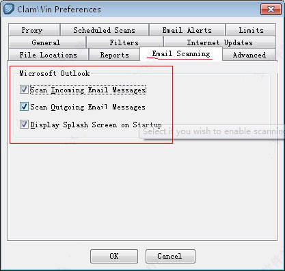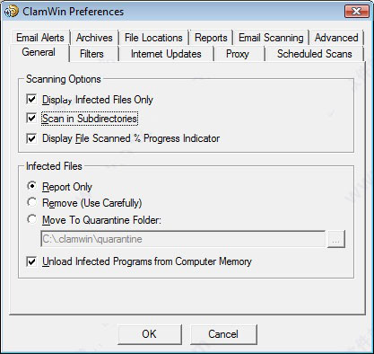 要配置ClamWin,右键单击系统托盘图标并选择Configure ClamWin,或从主程序窗口中选择Tools菜单中的Preferences。 将显示11个选项卡的对话框(如果您没有安装Microsoft加载项,将不会显示“电子邮件扫描”选项卡)。 单击确定将关闭对话框并保存所做的任何更改。 单击取消将关闭对话框而不保存任何更改。