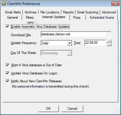 在此选项卡上,您可以控制ClamWin如何获取病毒数据库的更新。