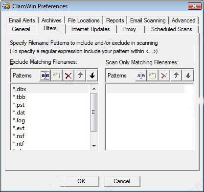 在此选项卡上,可以将ClamWin配置为仅扫描特定类型的文件,或者忽略某些类型的文件。 这两者可以结合使用,以更好地控制扫描的文件类型。可以通过指定完整路径来过滤特定文件,例如:C:\Path\to\folder\File.ext。请注意,*不匹配\,所以如果你想包括或排除一个文件夹与所有子文件夹,你需要使用正则表达式的语法,并在末尾添加.* 。