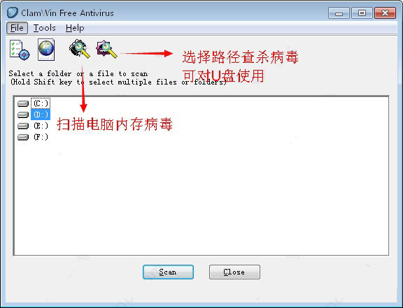 6、注意,ClamWin虽然是免费反病毒软件但不具备实时扫描监控功能。需要手动扫描文件才能检测病毒或间谍软件。