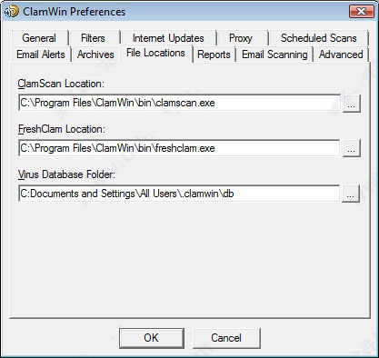 此选项卡允许ClamScan程序文件,FreshClam程序文件(用于检索数据库更新的程序)和病毒库的位置被更改。