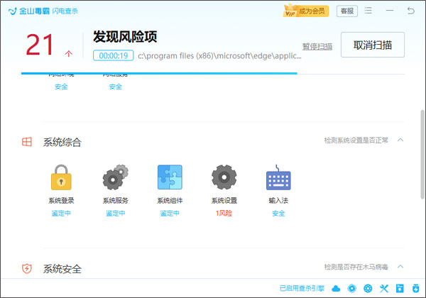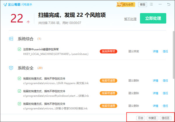 它是从上网设置、系统综合、系统安全、浏览器、移动设备等方面来查看是否存在风险项。对于存在报毒但需要使用的文件,可以先将它放置到信任区中,这样就不会实时弹出警告提示了。