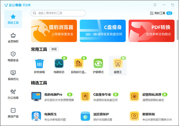 百宝箱主要分为了精选工具、会员特权、电脑安全、系统优化、办公效率以及其他产品等多样化工具,用户根据自身的需要选择下载并使用。