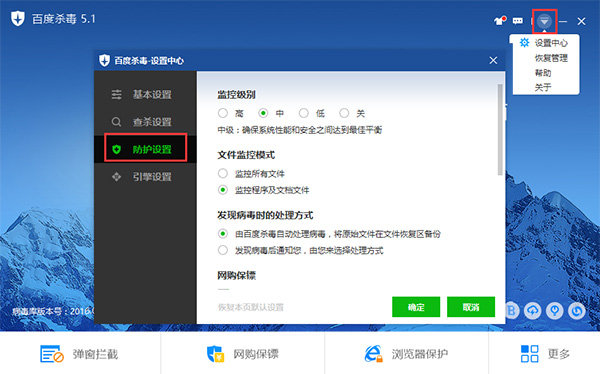 二、进入设置中心,点击左侧栏的【防护设置】,就可以在右边面板中进行相关设置了,设置完毕点【确定】。