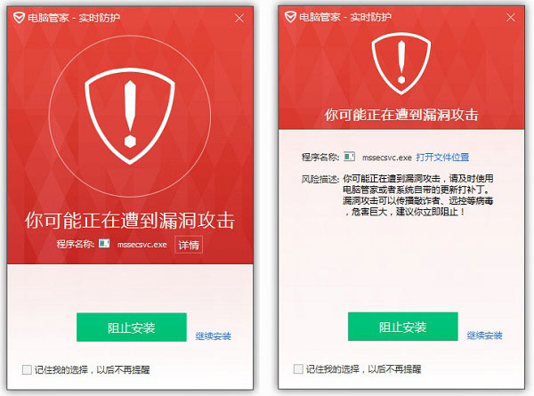 请按提示及时修复漏洞、并开启主动防御系统,避免中招!