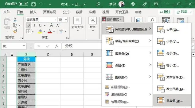 首先选中数据列,菜单中选择【开始】-【条件格式】-【突出显示单元格规则】-【重复值】,如下图所示。