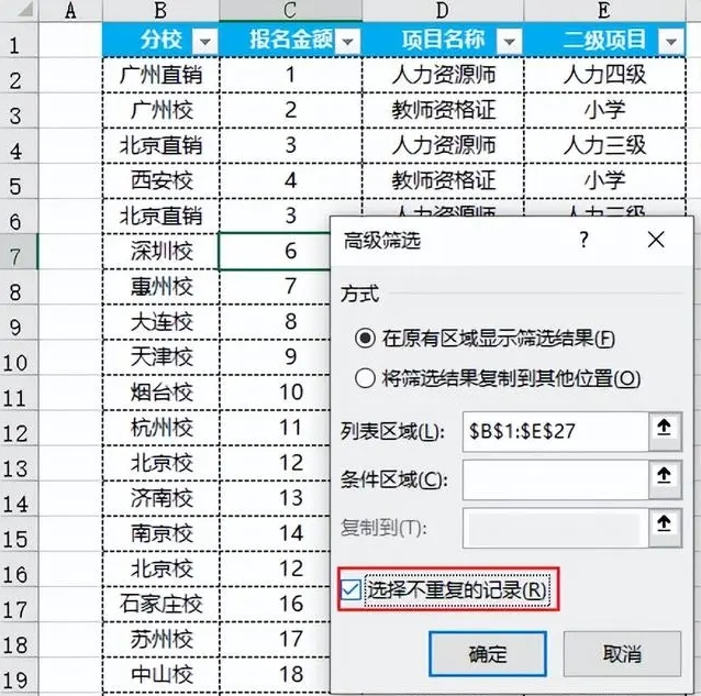 点击【确定】后,得到筛选后的不重复记录,如下图所示。