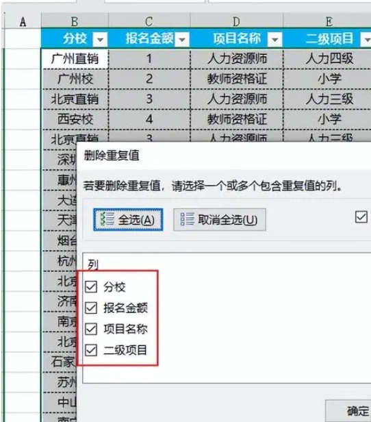 在弹出的窗口中,选择需要去重的字段即可,如下图所示。