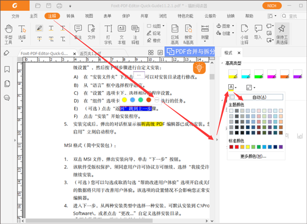 如果系统默认的6种颜色,都不太喜欢,福昕阅读器也支持自定义颜色设置,点击更多颜色,操作如下