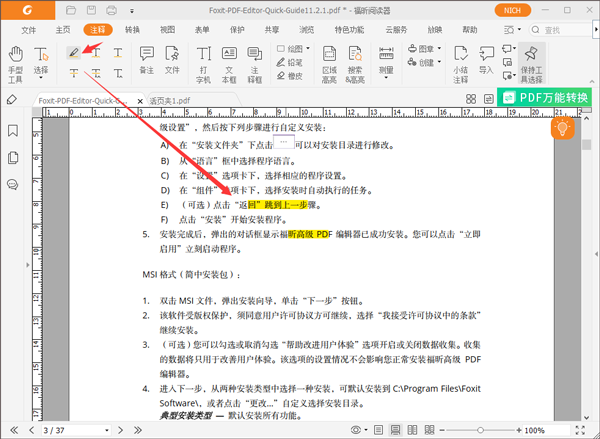 福昕阅读器提供不同类型的注释工具: 文本标注工具、图钉工具、打字机工具和绘图工具