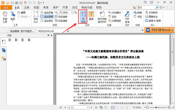 1、双击foxit reader运行,接着我们打开要编辑的PDF文件(打开不会的小伙伴可参考上述内容)。然后点击菜单栏的“主页”选项,在它的工具栏中找到“打字机”选项。如下图所示: