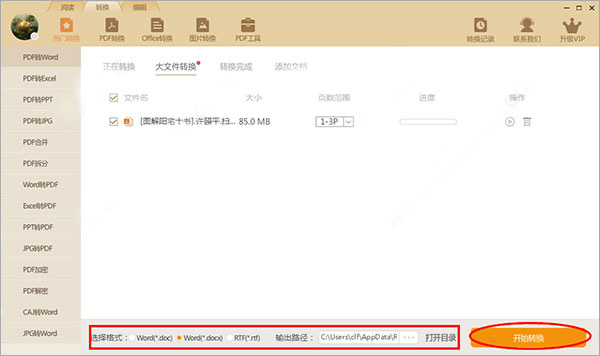 4、然后对pdf文件进行格式,输出路劲设置,点击开始转换即可。