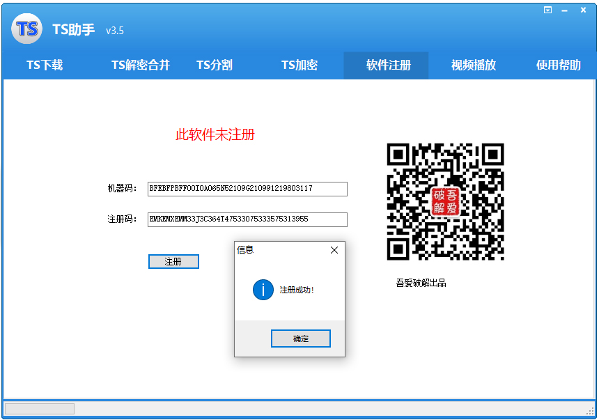 1、下载软件压缩包文件,解压之后直接点击“TS助手.exe”运行程序,点击软件注册,输入任意注册码即可破解成功!