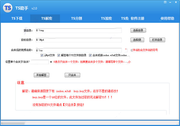 TS可以对加过密的文件可以解密,前提是要密钥正确,网上有些教学课件目前无法解密!解密是可以只要一个合并的mp4文件,也可以把每个TS切片解密,也可以对没有加密的TS切片进行按指定大小合并!首先要求源目录中有 ts文件 index.m3u8列表文件,ts文件与列表文件中的名字 或路径要一样,如果加密的还要有 key.key密钥文件,名字不是的更改一下!