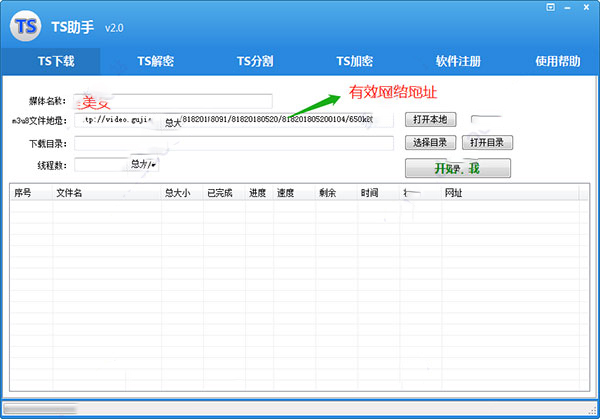 ①TS下载要填写下载的视频名称,m3u8列表文件网络地址 或 本地路径,要确保网地址的存在,因为是网络下载,当打开本地路径时,里面的列表必须是网络有效地址!还有下载目录要填写,下载线程数可以不填。