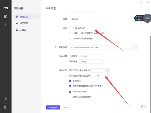 4、你可以设置开启启动,或者是默认下载的路径。还可以点击进阶设置