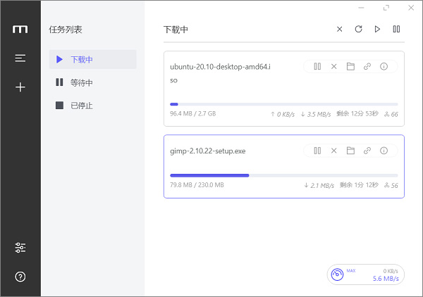 图中是一个BT任务与一个https任务,分别是Ubuntu系统镜像(BT)与Gimp安装包(https),下载速度都非常快。
