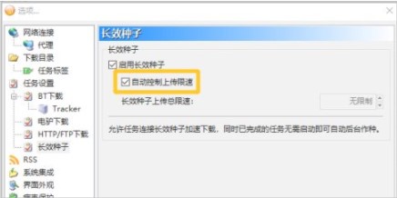 3、启用长效种子后,勾选“自动控制上传限速”选项的勾选开关,点击“确定”按钮,这样就可以启用长效种子功能了。