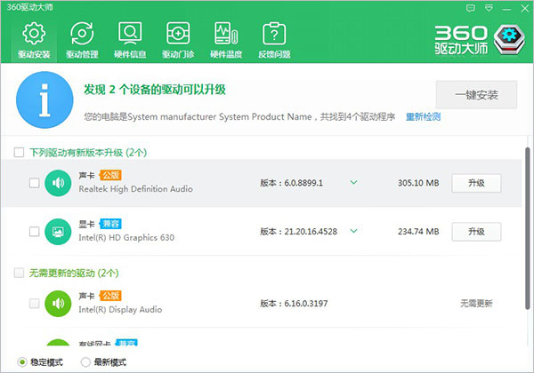 3、显示的驱动是一些可以更新,但是不更新也不会影响计算机正常运行的驱动,然后点击一键安装;