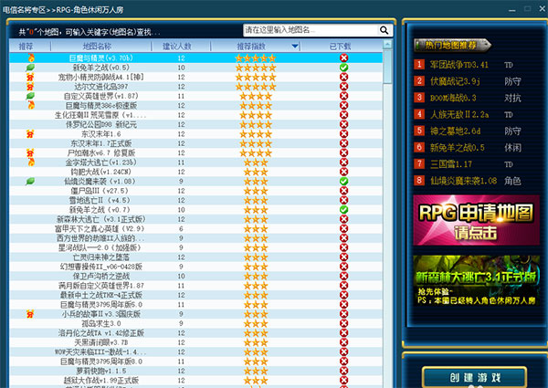 5、进入到创建游戏界面,我们在界面上可以看到有地图名称、人数、推荐指数、已下载选项,我们双击该地图就可以进行下载,然后点击界面下方的创建游戏。