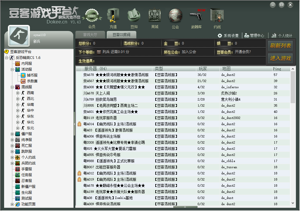 4、如果要玩混战模式,就点击下混战服,就可以看到游戏服务器列表了。注意红框里的内容,玩家数量,地图是否喜欢,ping值(决定游戏中的延迟)。