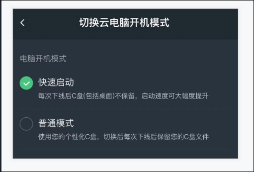 如希望您的专属云电脑更快启动,可考虑将您的云电脑切换为快速启动模式。快速模式下您的C盘数据(含桌面)每次下线后都会重置,请勿在C盘中存放个人数据。切换后如需找回原先C盘中内容,可切换回普通启动模式。