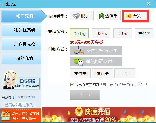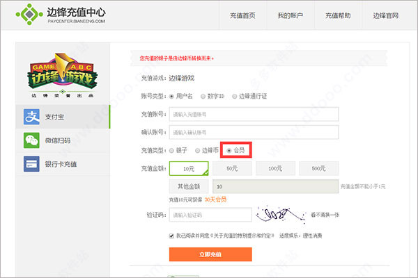 方式二:登录边锋游戏大厅,点快速充值,充值类型选择会员。