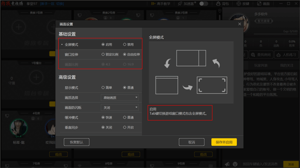 2、然后再画面设置界面中将全屏模式开启,全屏模式的切换方式可以在右边看到,如tab键切换游戏窗口模式