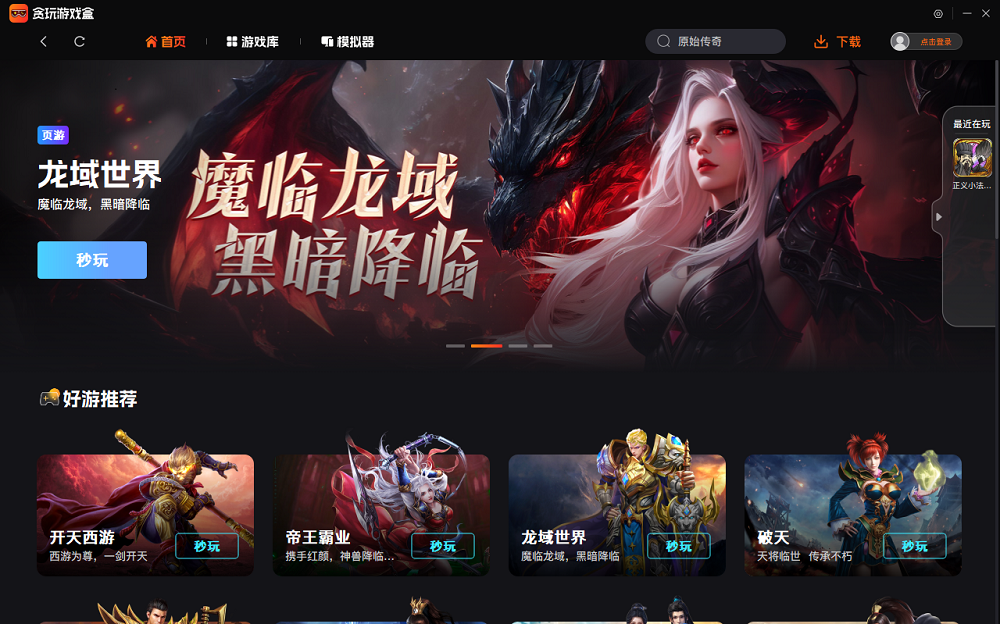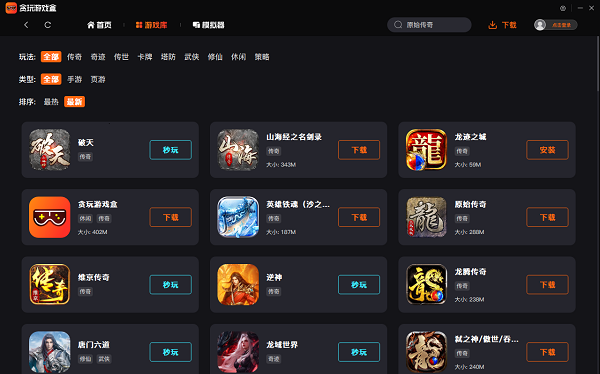 贪玩游戏盒电脑版是一款专为Windows系统设计的游戏平台软件。这里有丰富的游戏库,涵盖了手游和页游等多种类型。无论是经典的传奇、卡牌、塔防,还是热门的修仙、策略游戏,这里应有尽有。而且,该软件自带模拟器功能,让玩家能够轻松在电脑上畅玩手机游戏,享受大屏幕带来的沉浸式游戏体验。