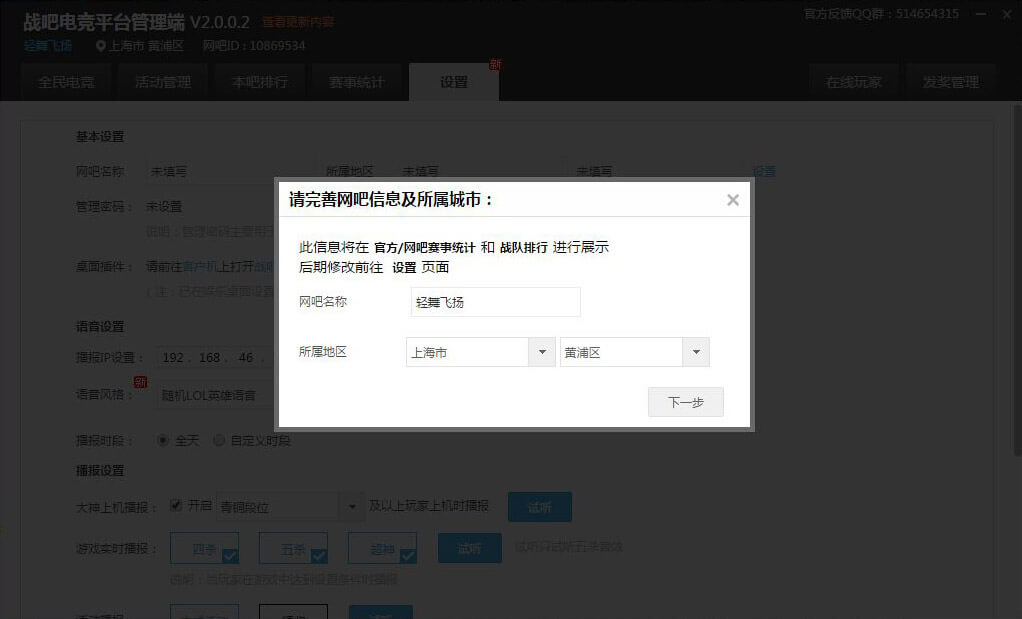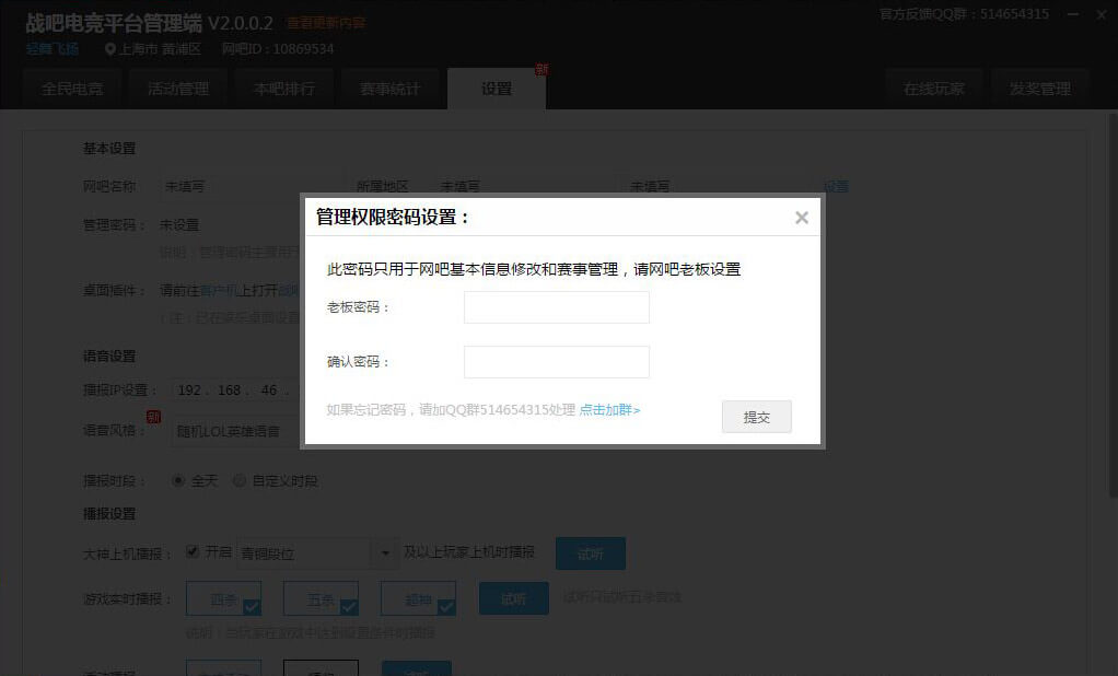 3、核对填写的网吧名称,勾选网吧所在地区,设置老板管理密码。